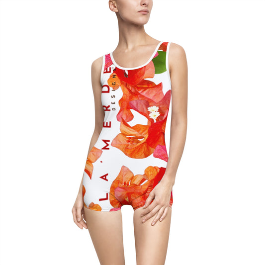 Vintage Sports Swimsuit: Brilliant Red, Pink & Orange Bougainvillea