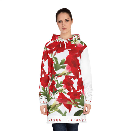 Long Sleeve Hoodie Mini Dress: Brilliant Red Tropical Hibiscus