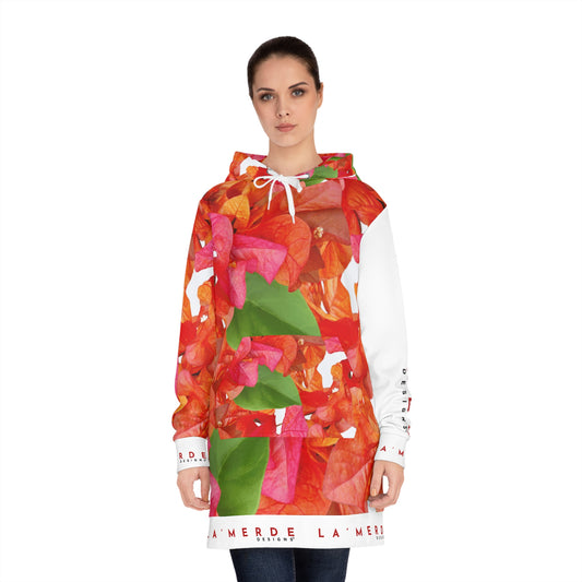 Long Sleeve Hoodie Mini Dress: Brilliant Red, Pink & Orange Bougainvillea